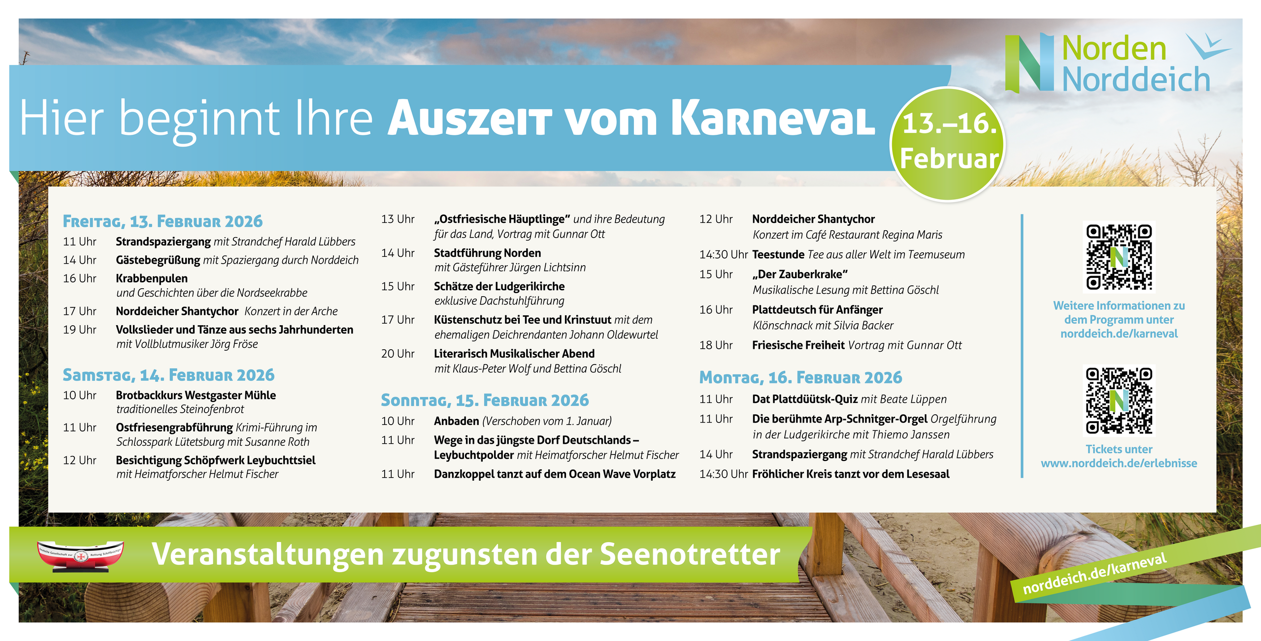Raus aus dem Konfettiregen und rein in ein unbeschwertes Naturerlebnis: in Norden-Norddeich, Ihrem Auszeit- und Tagesausflugsziel an der niedersächsischen Nordseeküste. Schließlich gibt es bei uns die ganze „fünfte Jahreszeit“ über klasse Küste statt olle Kamelle! Die Veranstaltungen zur Auszeit vom Karneval sind vor allem eines – ausgesprochen ruhig und gemütlich und deshalb typisch ostfriesisch. Das Motto lautet „Traditionen, Leben und starke Menschen hinterm Deich“